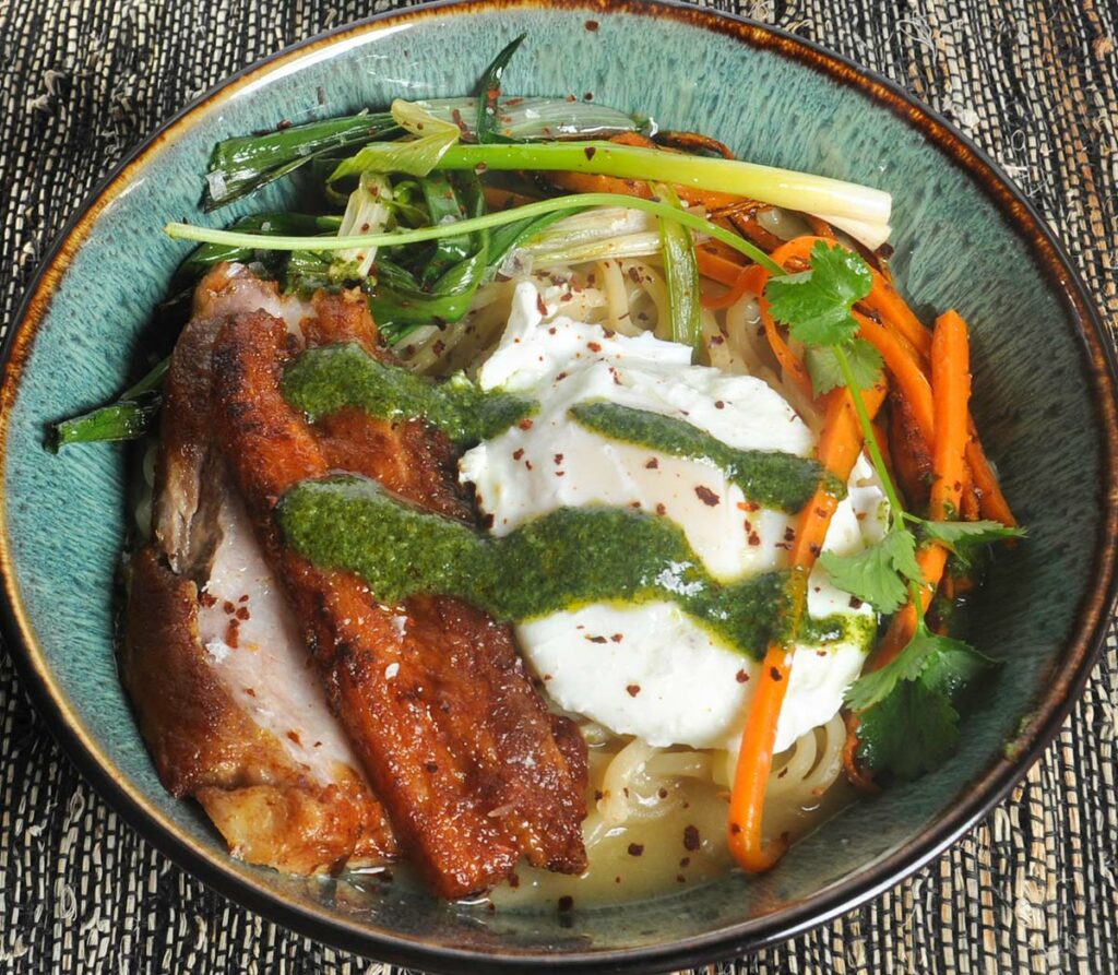 Enjoy this breakfast noodle bowl with savory broth. Add crispy pork belly, a poached egg, fresh veggies such as sliced carrots, green onions and cilantro, and finish with a drizzle of Armanino Cilantro Pesto.
