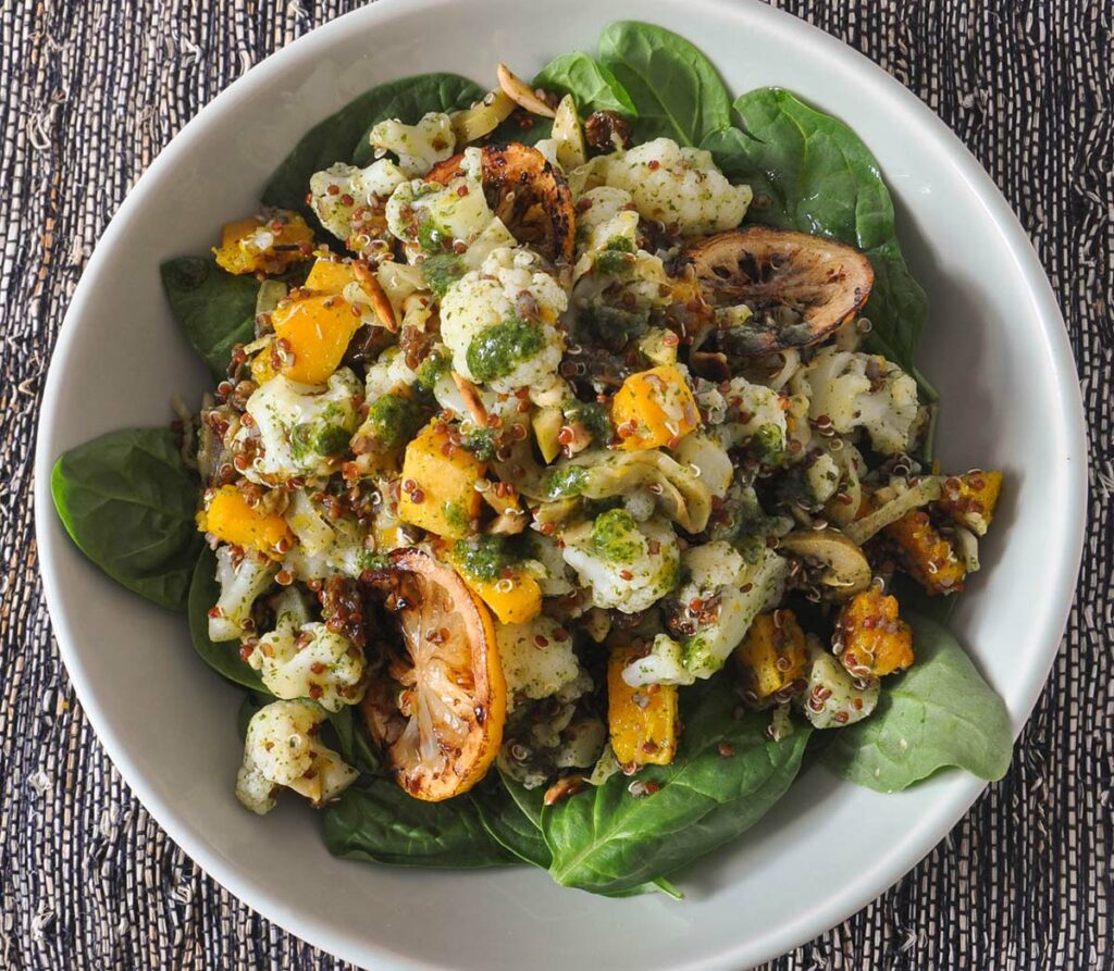 Cauliflower, Quinoa & Butternut Squash on a bed of Baby Spinach
