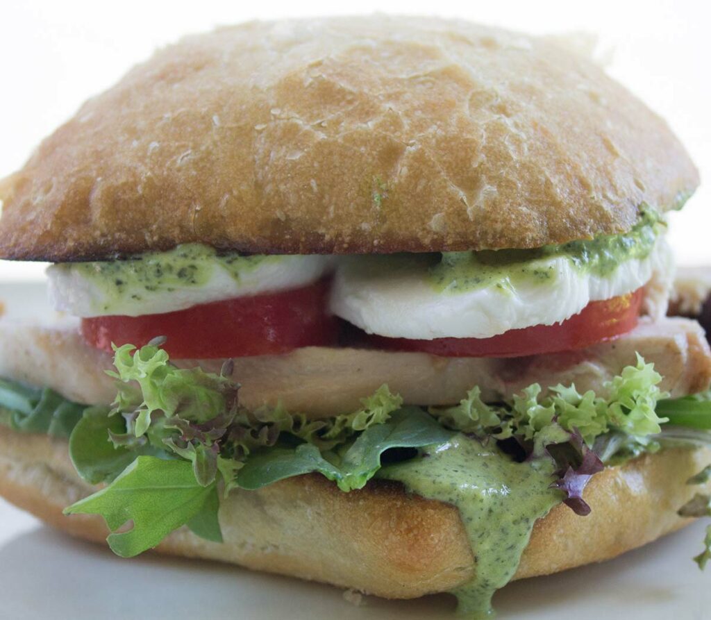 Spread a creamy Basil Pesto aioli on lightly toasted ciabatta bread and top with lettuce, grilled chicken, tomatoes, slices of fresh mozzarella cheese.