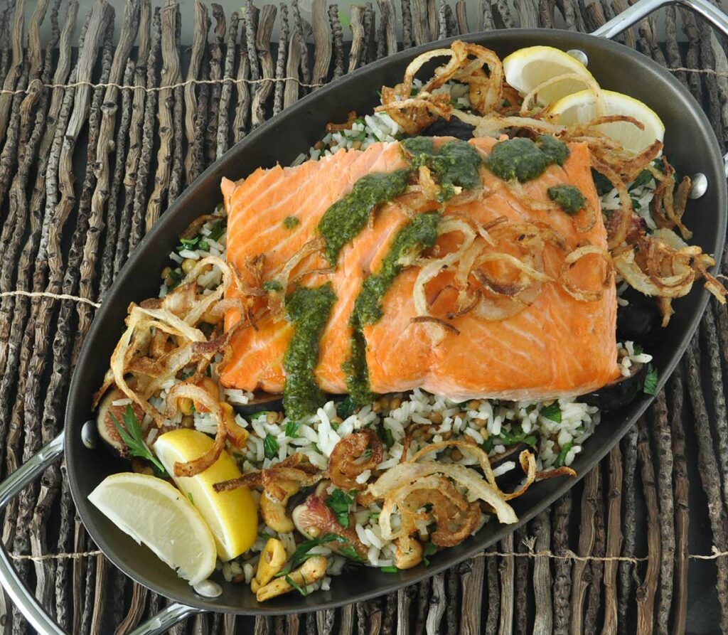 Place baked salmon on a bed of fig and toasted cashew biryani. Finish with a drizzle of Armanino Cilantro Pesto.
