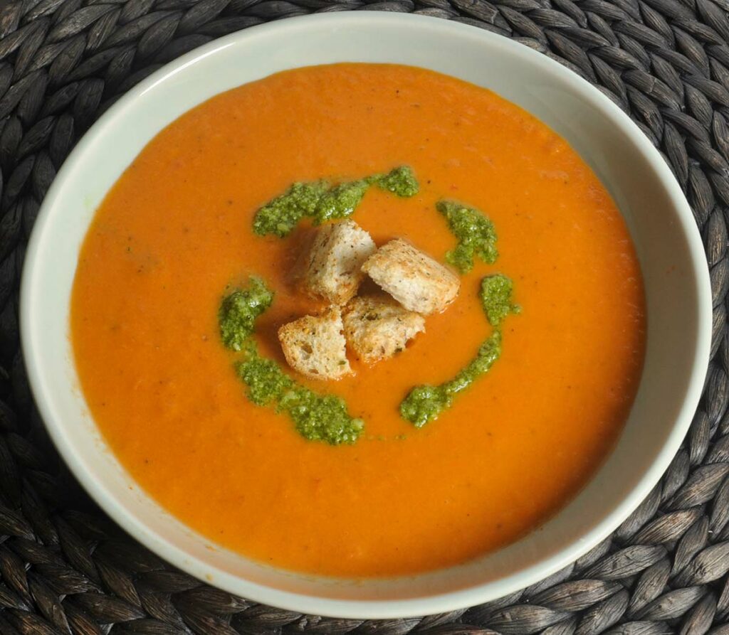 Finish tomato soup with croutons and drizzle of Basil pesto. We think tomatoes and Basil Pesto go together like peas and carrots!