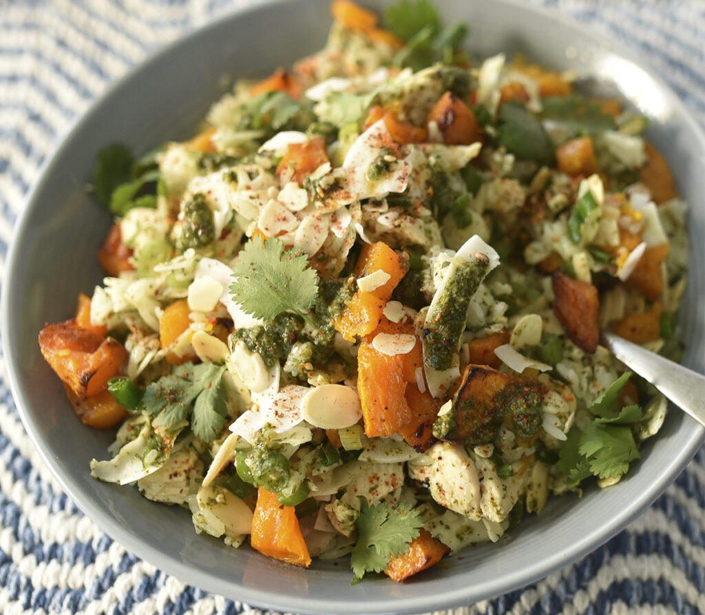 Combine jasmine rice, grilled chicken, roasted butternut squash, green onions, silvered toasted almonds, coconut shavings, salt, and top with Armanino Cilantro Pesto Sauce. Optionally sprinkle with Togarashi Seasoning.