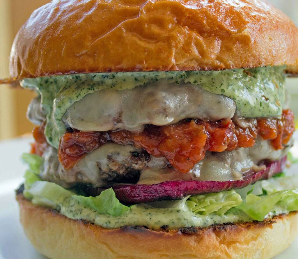 Double Deck Burger with Tomato Jam & Cilantro Pesto Aioli