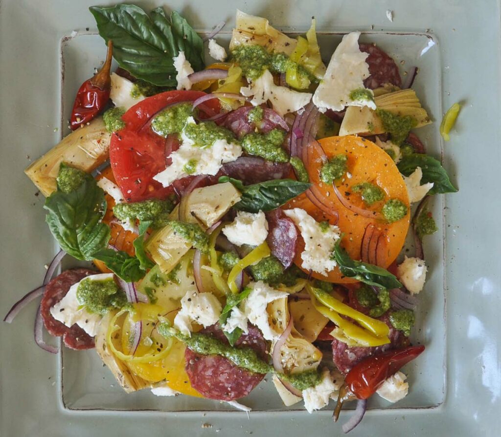 Assemble an antipasto salad with salami, marinated artichokes, roasted red peppers, heirloom tomatoes, pepperoncini peppers, slices of red onion, fresh basil and mozzarella cheese, with an EVOO and vinegar dressing. Finish with a drizzle of Basil Pesto.