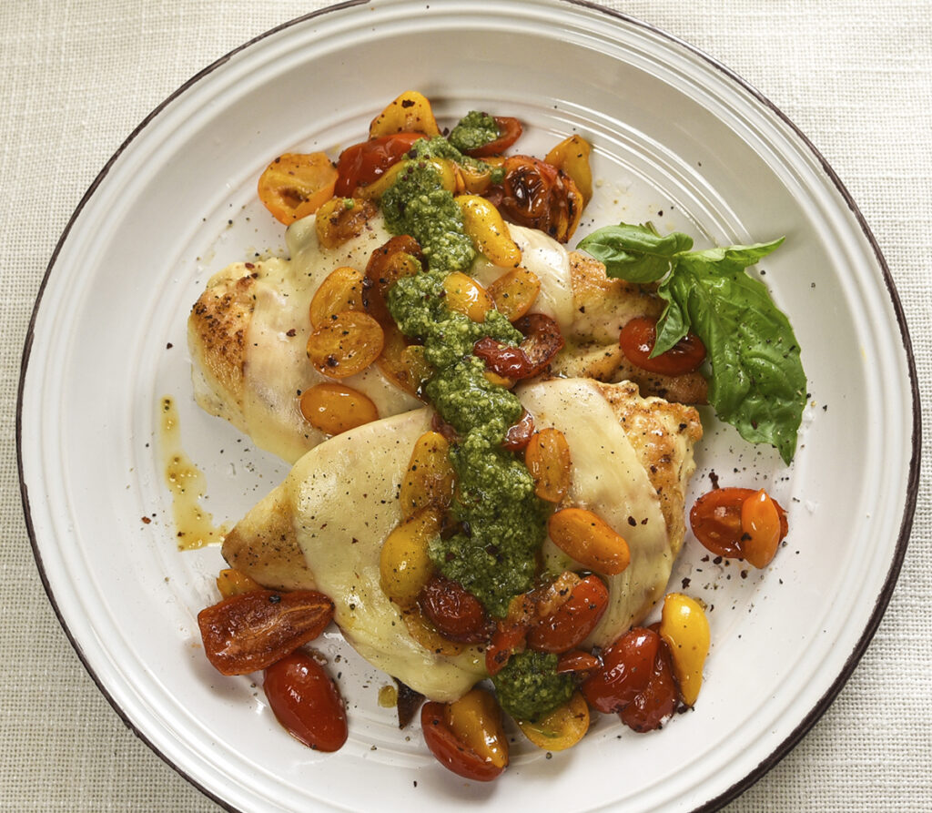 Who says Margherita style is only for pizza? Try this version with tender chicken breast topped with melted mozzarella, sauteed heirloom baby tomatoes, and finish with Armanino Basil Pesto.