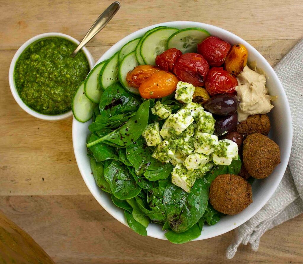 On a bed of spinach dressed with oil and vinegar, add falafel patties, roasted cherry tomatoes, sliced cucumbers, Basil Pesto marinated feta cheese, Kalamata olives, spinach and a dollup hummus.