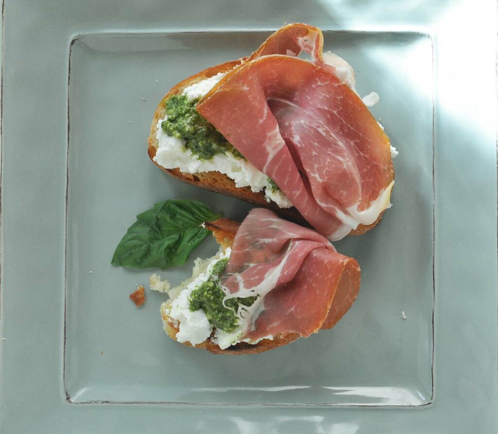 Spread fresh whole milk ricotta over crostini and add Basil Pesto and prosciutto on top.