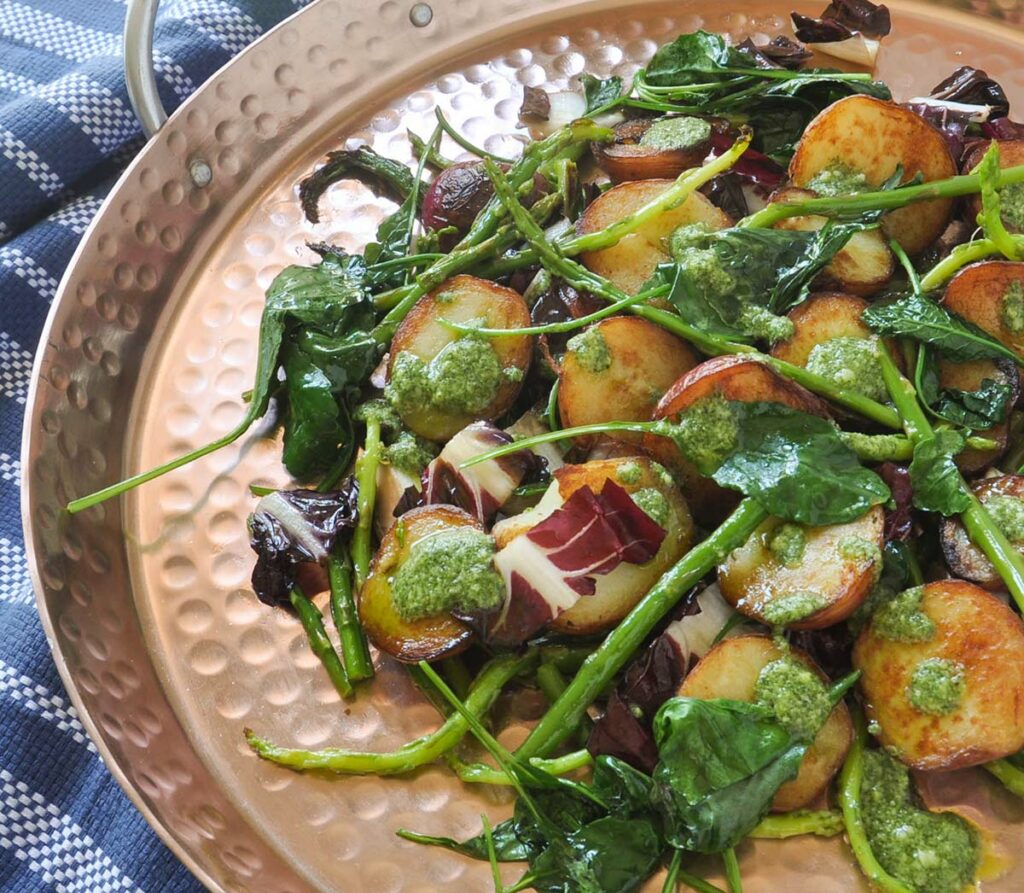 Combine grilled baby Yukon gold and asparagus with wilted greens and dress with a drizzle of Basil Pesto.