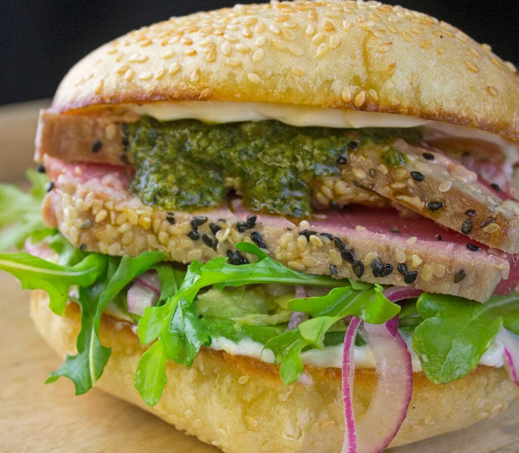 On a warm bun with mayo and Chimichurri Sauce, add seared ahi tuna, arugula and pickled red onions.