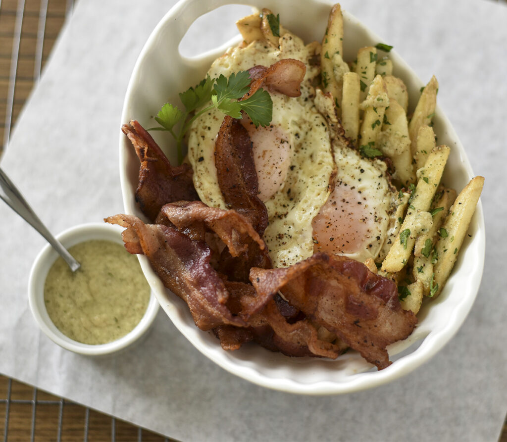 Mix Creamy Garlic Sauce with oil, toss with freshly fried french fries and minced fresh parsley. Served here with the traditional bacon & eggs.