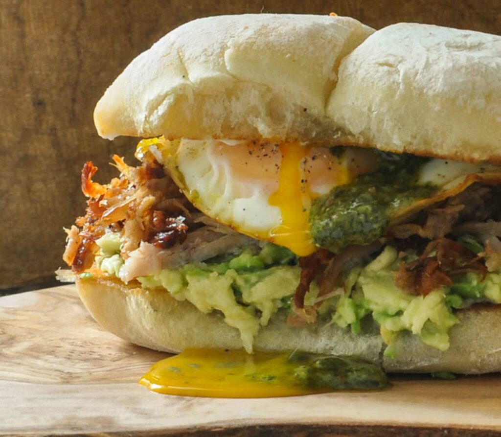 On a lightly toasted soft roll, add mashed avocado, crispy carnitas, a fried egg and top with Armanino Chimichurri Sauce.