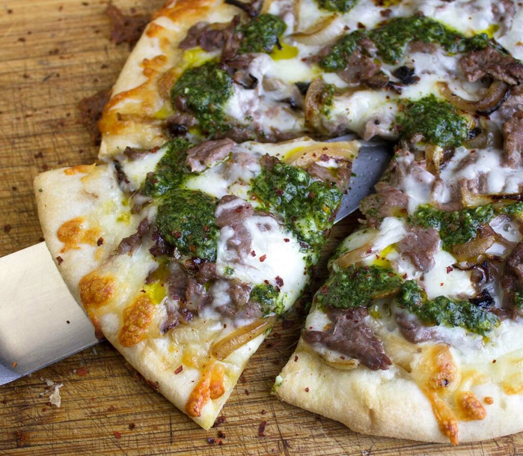 Philly cheesesteak pizza with caramelized onions and a finishing drizzle of Chimichurri Sauce