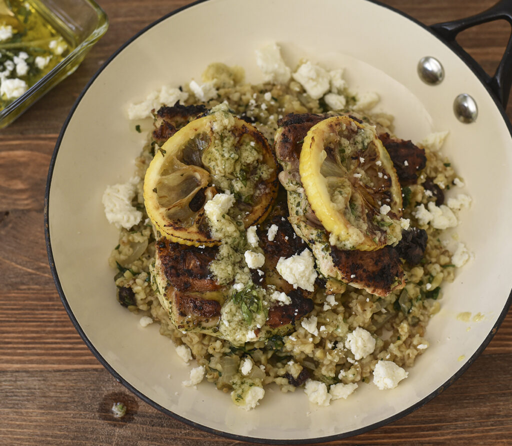 To make the sauce mix together 8 oz Armanino Creamy Garlic Sauce, 8 oz EVOO, 2 tbsp lemon juice, 1 tsp lemon zest, 1/4 cup crumbled feta cheese, and 2 tbsp minced Italian parsley. Served with crispy chicken thighs and freekah pilaf.