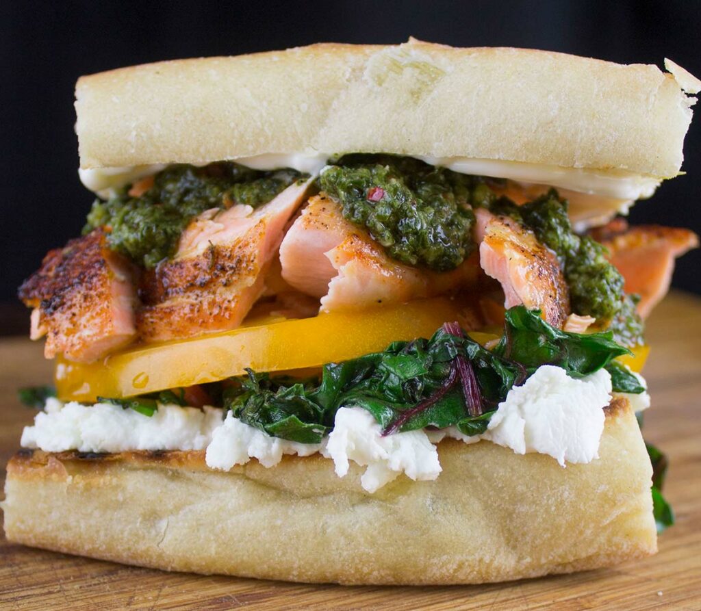 On your favorite fresh bread add grilled salmon, golden tomatoes, wilted greens, goat cheese, and Armanino Chimichurri Sauce.