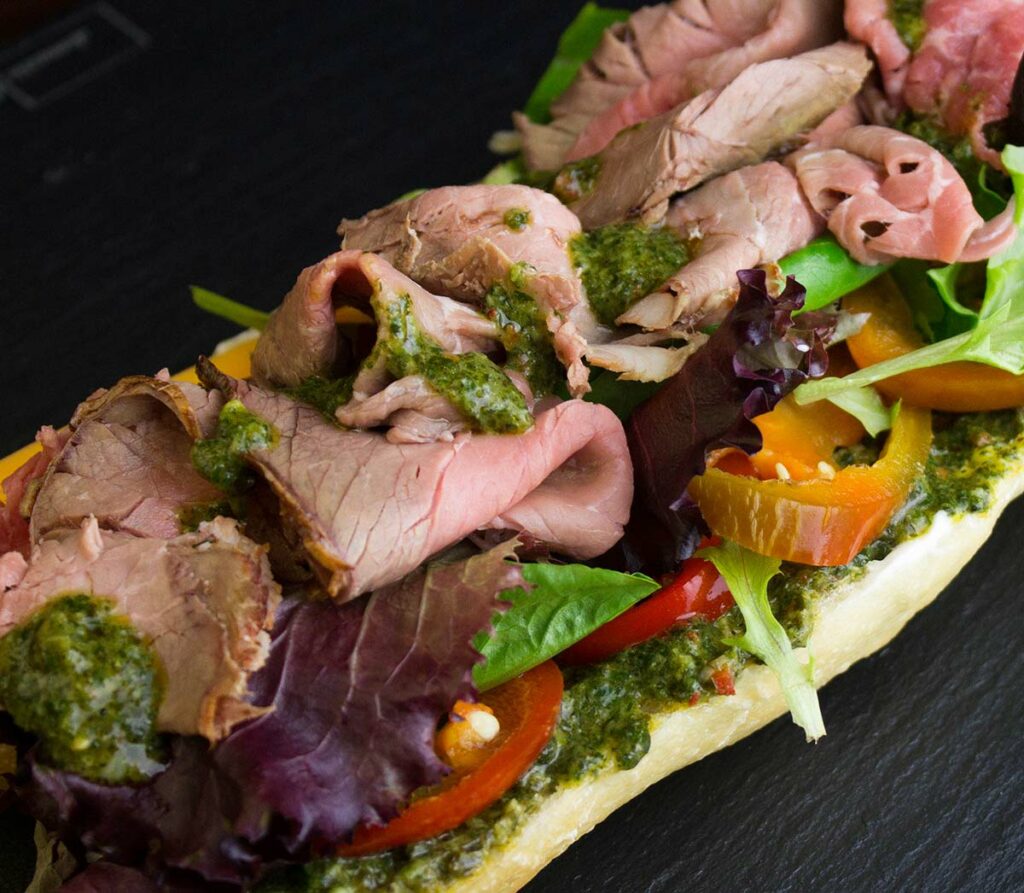 Spread Armanino Chimichurri Sauce on a baguette and layer sweet and hot peppers, lettuce and sliced roast beef. Drizzle more Chimichurri sauce on top.